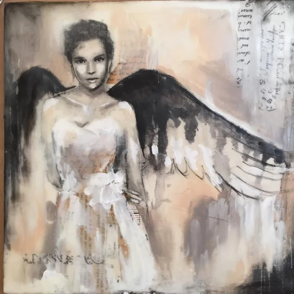Acrylic, collage, ink, charcoal and wax.